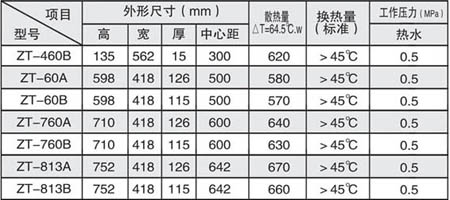 鑄鐵式系列換散熱水器 內(nèi)腔潔凈地粘砂,承壓高、耐腐蝕、壽命長、薄型設(shè)計,外形美觀大方,經(jīng)濟(jì)實用、大眾消費,貴族享受 技術(shù)參數(shù)表 |
